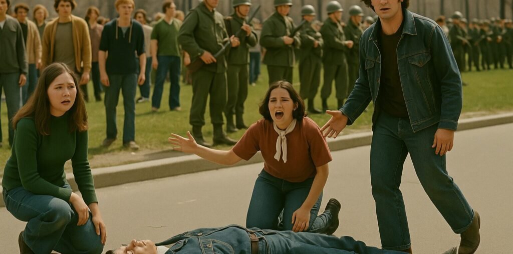 Just before 12:30 PM, a group of National Guardsmen suddenly turned and fired into the crowd—without warning or a direct order. Thirteen seconds of gunfire changed history: four students were killed (Allison Krause, Jeffrey Miller, Sandra Scheuer, and William Schroeder), and nine others were wounded.